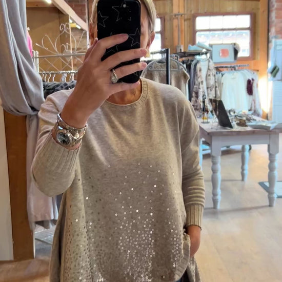 Gorgeous supersoft feel fine knit with scattered sequins across the bottom - one size suits upto 14/16.